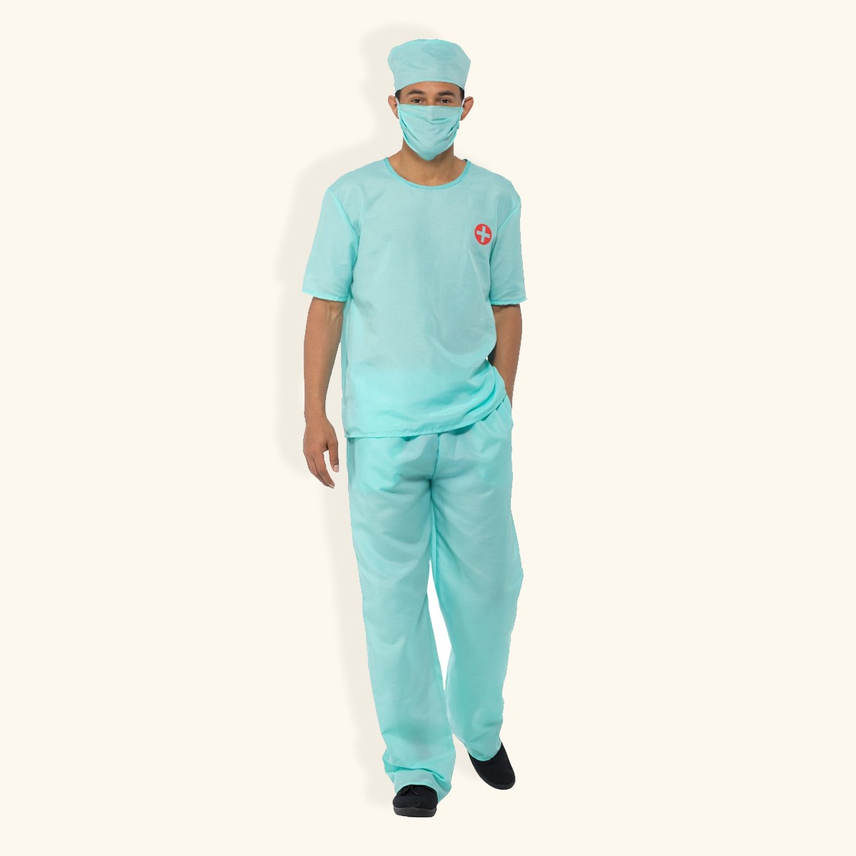 Dokterskostuum voor verkleedfeestjes en carnaval. Dit feestkostuum bevat een shirt, broek, hoed, mondkapje en stethoscoop.