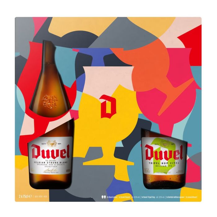 Duvel geschenkverpakking met unieke, exclusieve opener, twee mooie proefglazen en een twee 75cl Duvels.De bieren in deze cadeauverpakking zijn met passie gebrouwen. Duvel is een natuurlijk bier met een subtiele bitterheid, een verfijnd aroma en een uitgesproken hopkarakter. De hergisting op fles en een lange rijping, garandeert een pure stijl, een delicate pareling en een aangename alcoholzoete smaak. Duvel Tripel Hop Citra is een intens hoppige Belgische IPA met verfrissende smaaktoetsen van agrum, dankzij de toevoeging van een derde hop Citra uit Yakima Valley in Washington, VS. Met dit cadeau kun je vol trots aankomen!