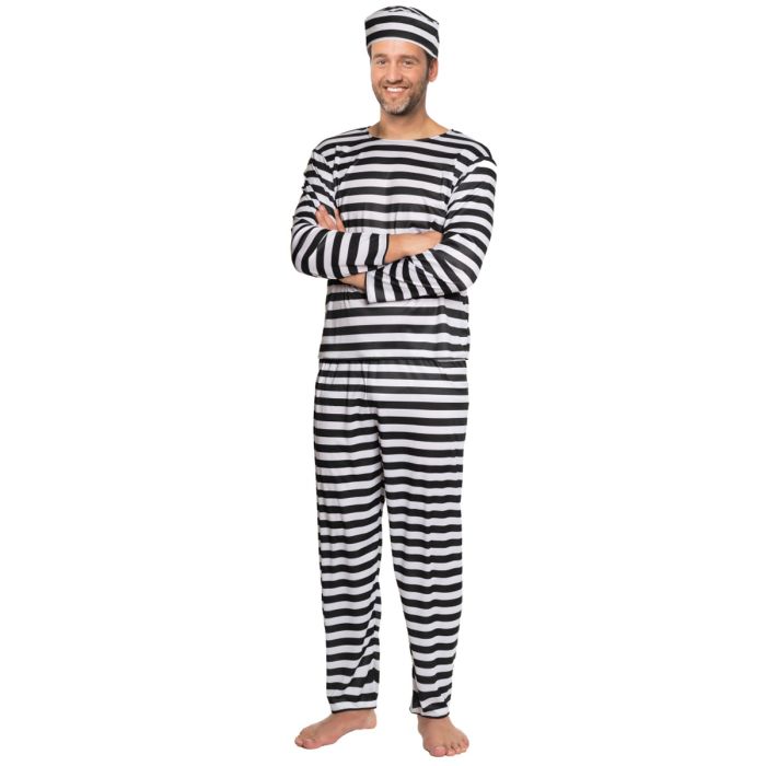 Gevangeniskostuum voor themafeesten en carnaval. Dit kostuum bestaat uit een shirt met lange mouwen, een broek en een muts.