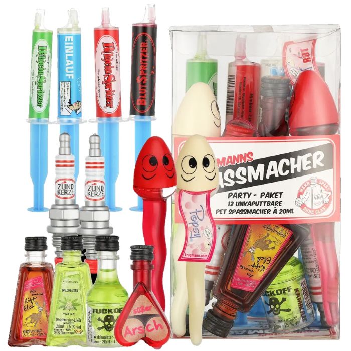 Hier zijn de belangrijkste details over deze party-set:Inhoud: Het mixpakket bevat 12 unieke, humoristisch vormgegeven "fun-spirituosen" (likeuren).