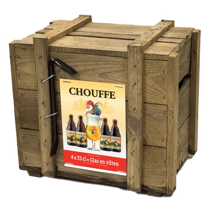 Ontdek 4 verschillende Chouffe bieren in dit luxe bierpakket. Deze houten bierkist is eenvoudig te openen met het stalen breekijzer. Een mooi kabouter cadeau!