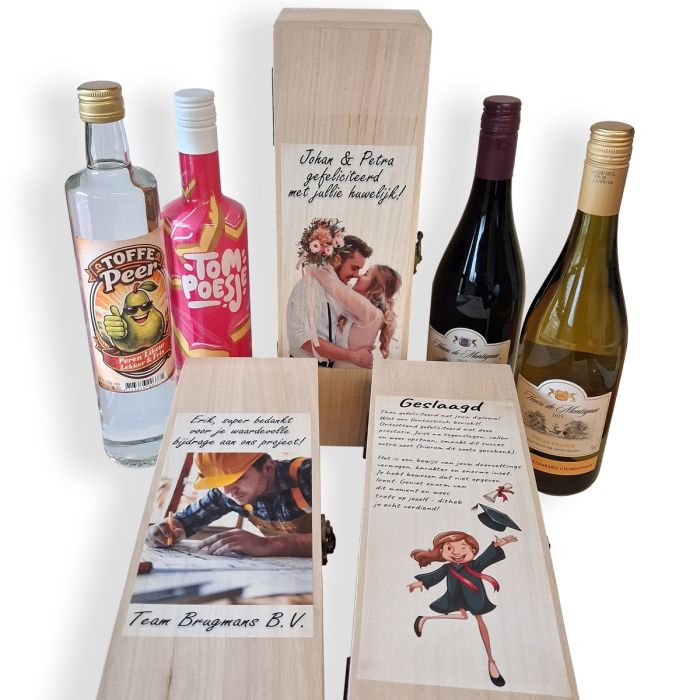 Maak een uniek cadeau met blijvende waarde. Een herinnering die nog lang gekoesterd wordt! Kies jouw favoriete drankje, voeg een persoonlijke touch toe en wij zorgen voor een prachtige presentatie en bezorging op de door jou gekozen datum. Makkelijk, origineel en gegarandeerd succes!
