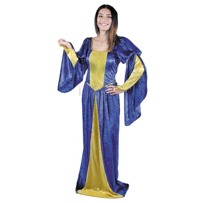 Middeleeuws jurk kostuum, ontworpen met een combinatie van blauw en geel fluweel-achtige stof. Perfect voor historische of themafeesten, vrijgezellenfeesten enz..