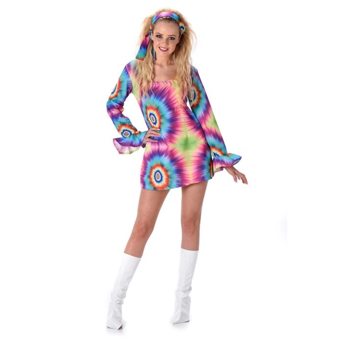 Kostuum voor verkleedfeest, carnaval, jaren 60/70 thema. De set bevat: jurk, hoofdband en laarshoezen.