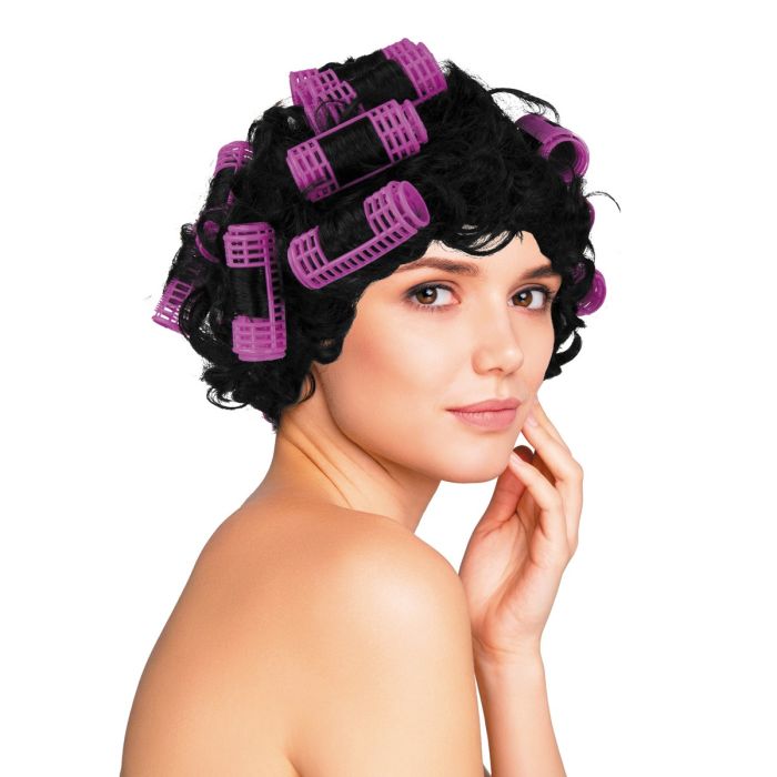 Pruik met zwarte krullen en roze krulspelden