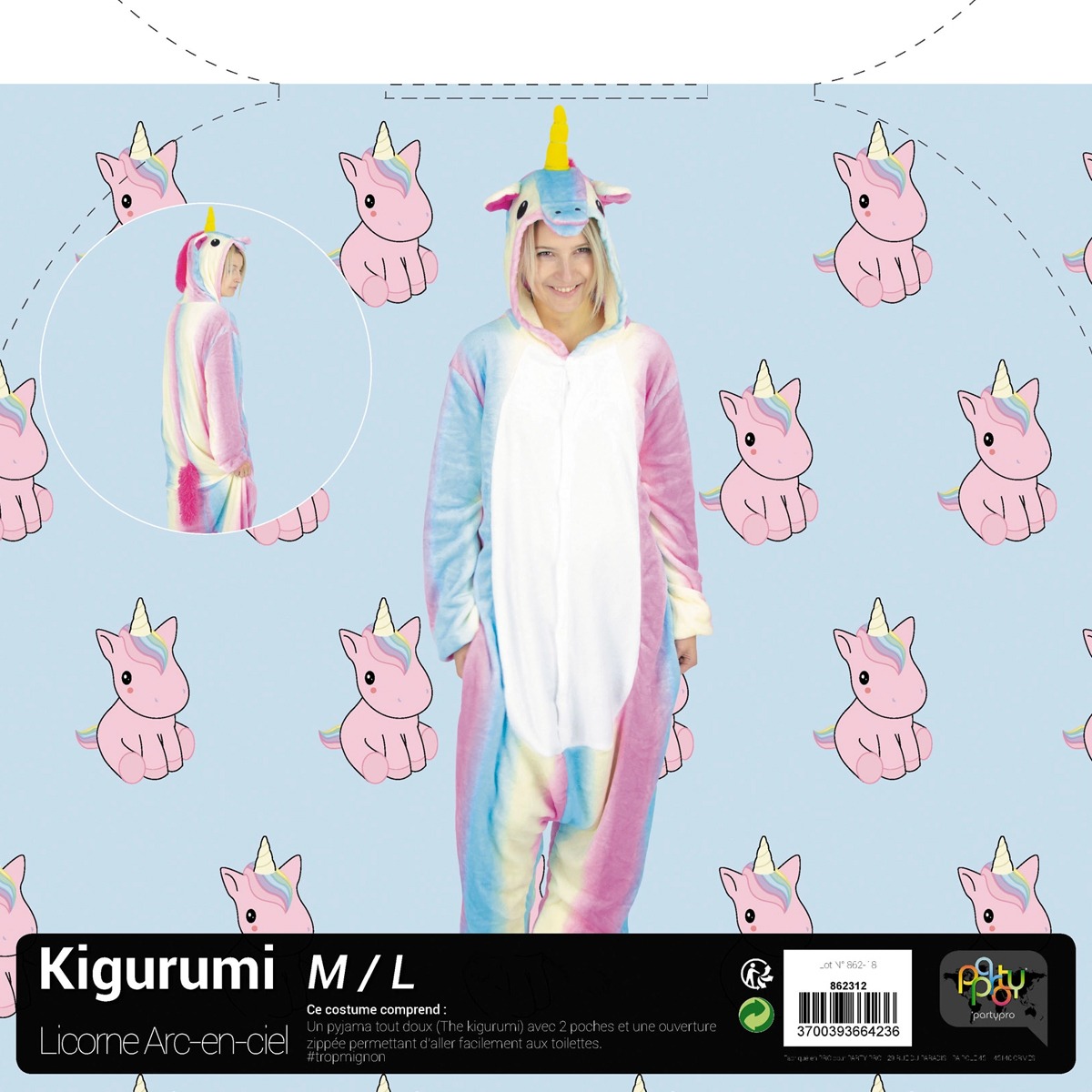 Regenboog eenhoorn kostuum voor volwassenen met twee zakken aan de voorkant van het pak en een ritssluiting, waardoor je naar het toilet kunt zonder het pak uit te hoeven doen.