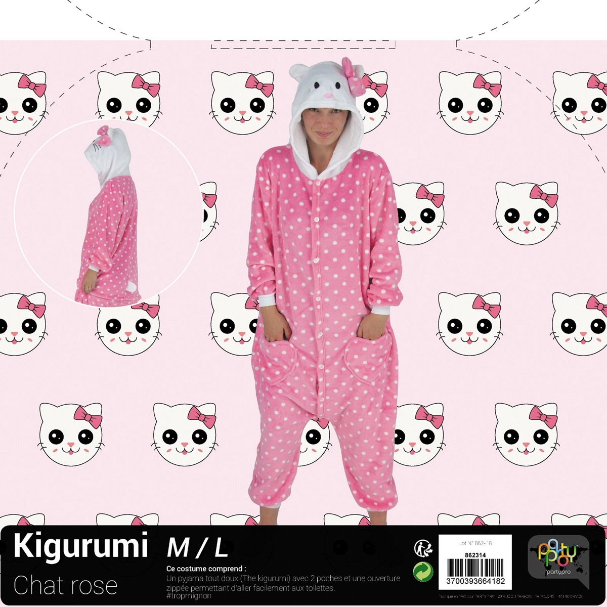 Roze kigurumi-kostuum voor volwassenen twee zakken aan de voorkant van het pak en ritssluiting zodat je naar de badkamer kunt zonder het pak uit te trekken.