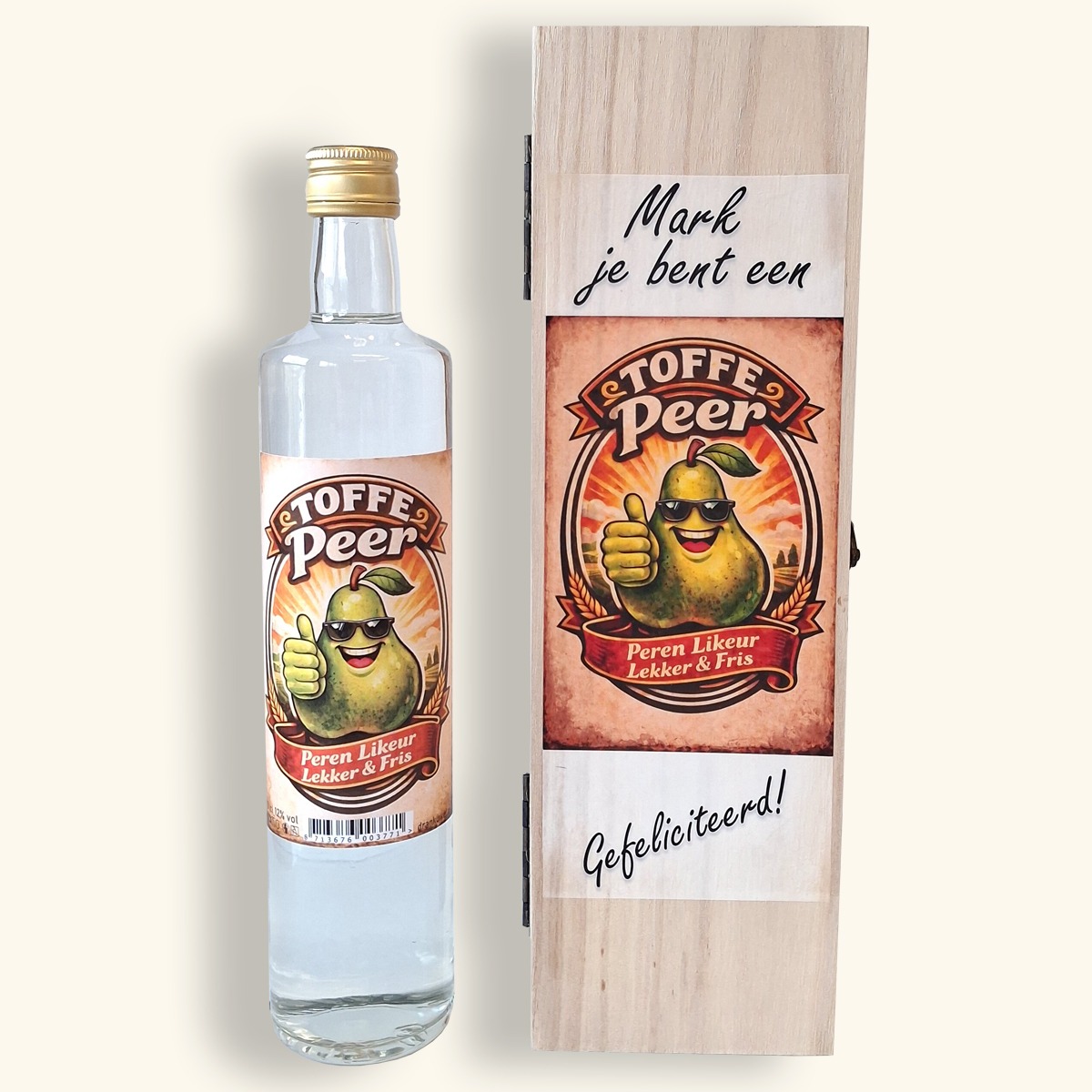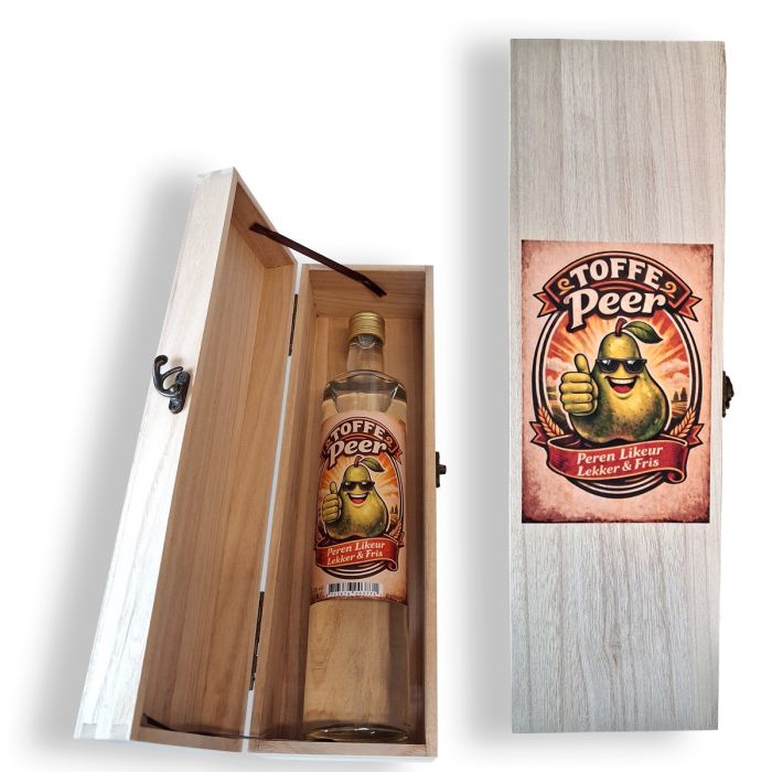 Toffe Peer Likeur 70cl in luxe wijnkistje - het perfecte cadeau