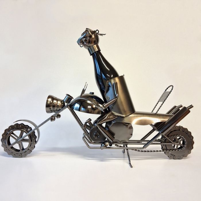 Stoer, stijlvol en een tikkeltje rebels - de Wijnfleshouder Chopper is de eyecatcher voor iedere motorliefhebber. Deze handgemaakte metalen chopper combineert vakmanschap met passie voor vrijheid en avontuur. Plaats een wijnfles in het frame en geef je interieur direct een krachtige uitstraling.
